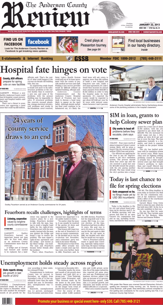 Anderson County, set to celebrate its 150th birthday in 2015. In 2009 parent company Garnett Publishing, Inc.,